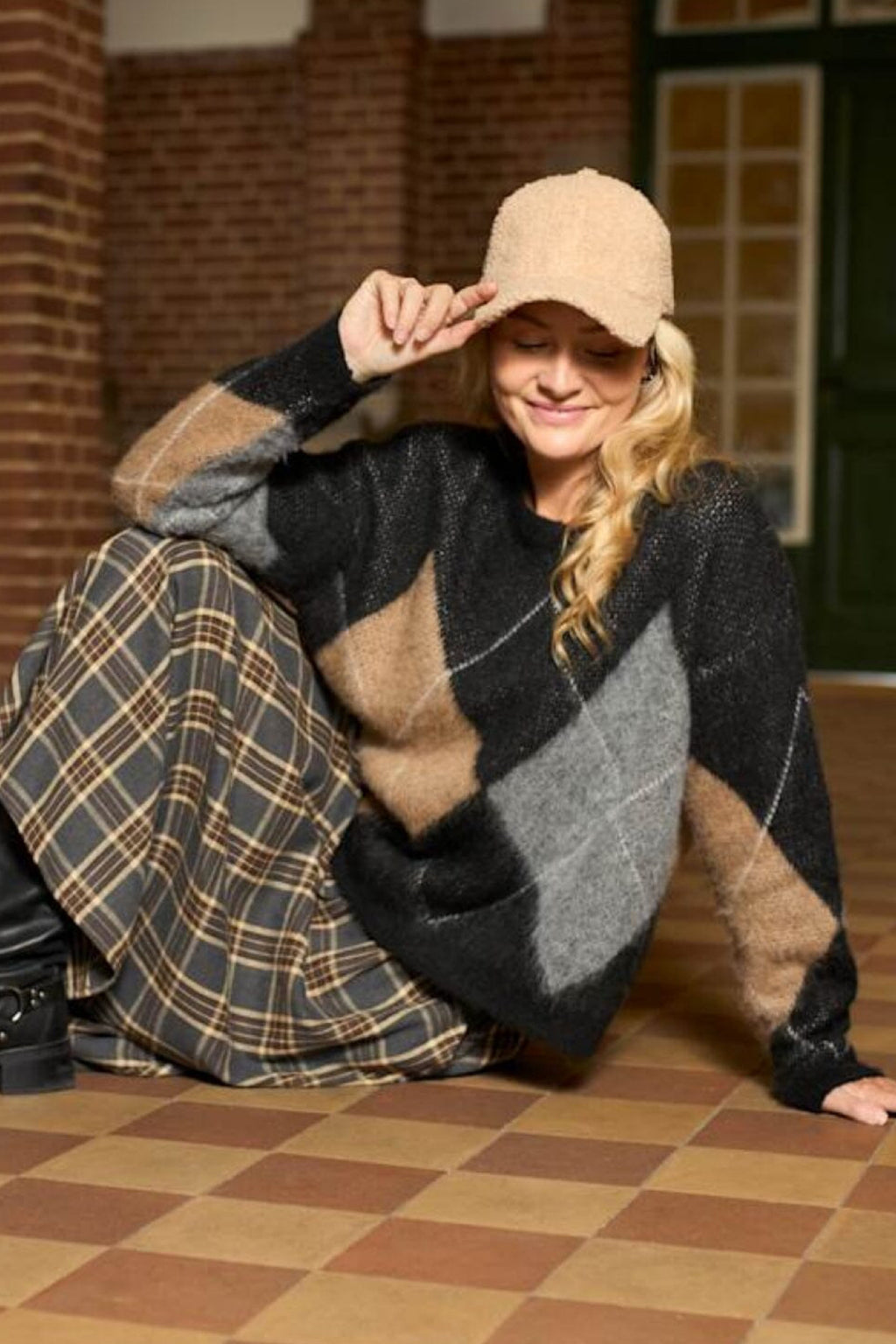Lækreste bløde strikkede trøje i sokkemønster Mål S/M: ½ Brystvidde: 58 cm. Længde: 60 cm.Materiale : 57% Acrylic, 29% Polyamide, 7% Wool, 7% Viscose