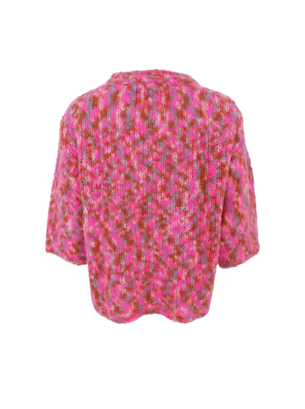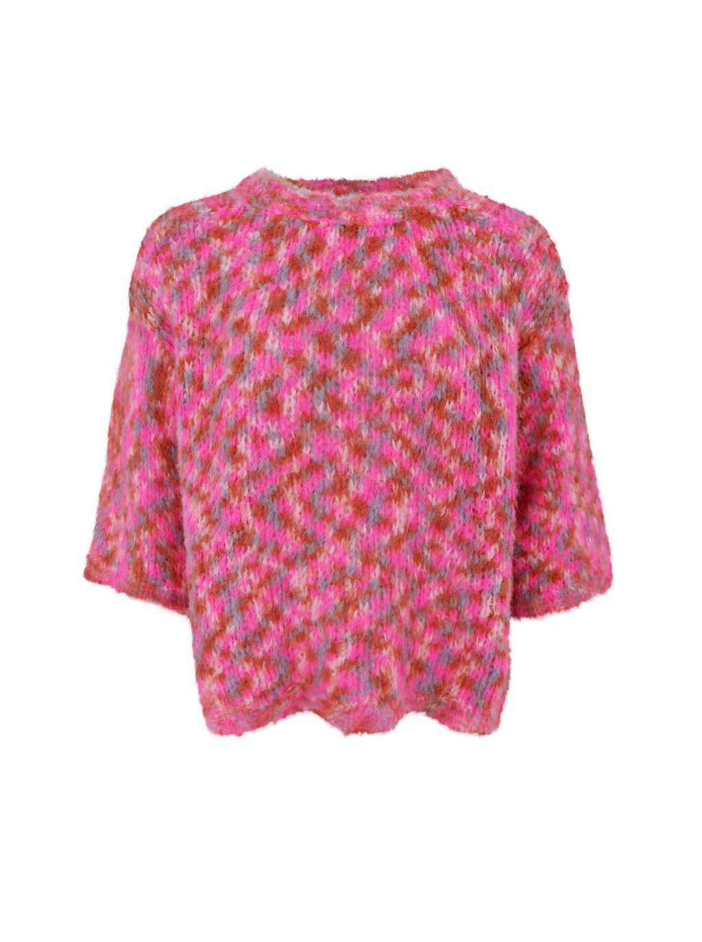 Kortærmet, kraftig striktrøje lavet af trykt flerfarvet garn. Mål S/M: ½ brystvidde: 56 cm Længde: 60 cmMateriale: 70% Acrylic, 10% Mohair, 10% Wool, 10% Polyamide