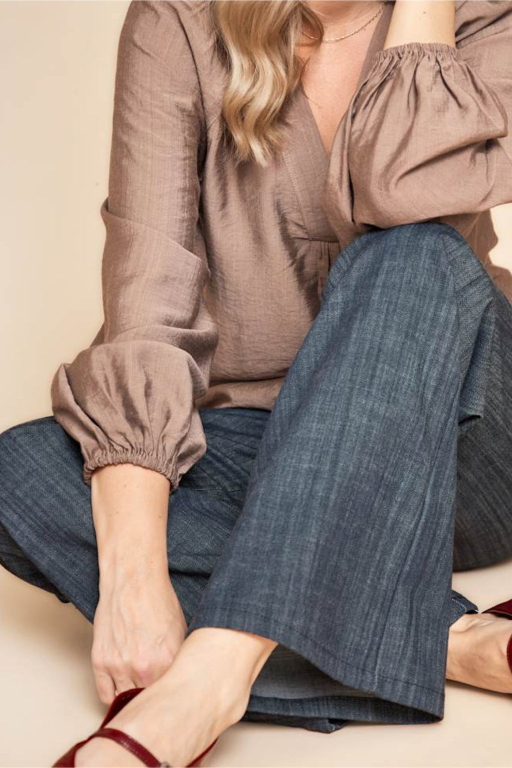 Giv dit outfit et feminint touch med denne fine bluse i en let og luftig kvalitet. Blusen har en elegant V-udskæring med læg foran, som skaber et flatterende fald. De lange ballonærmer med elastik ved håndleddet tilfører volumen og en afslappet elegance. Perfekt til både hverdagsbrug og pænere lejligheder – style den med jeans, bukser eller en nederdel for et stilfuld look.