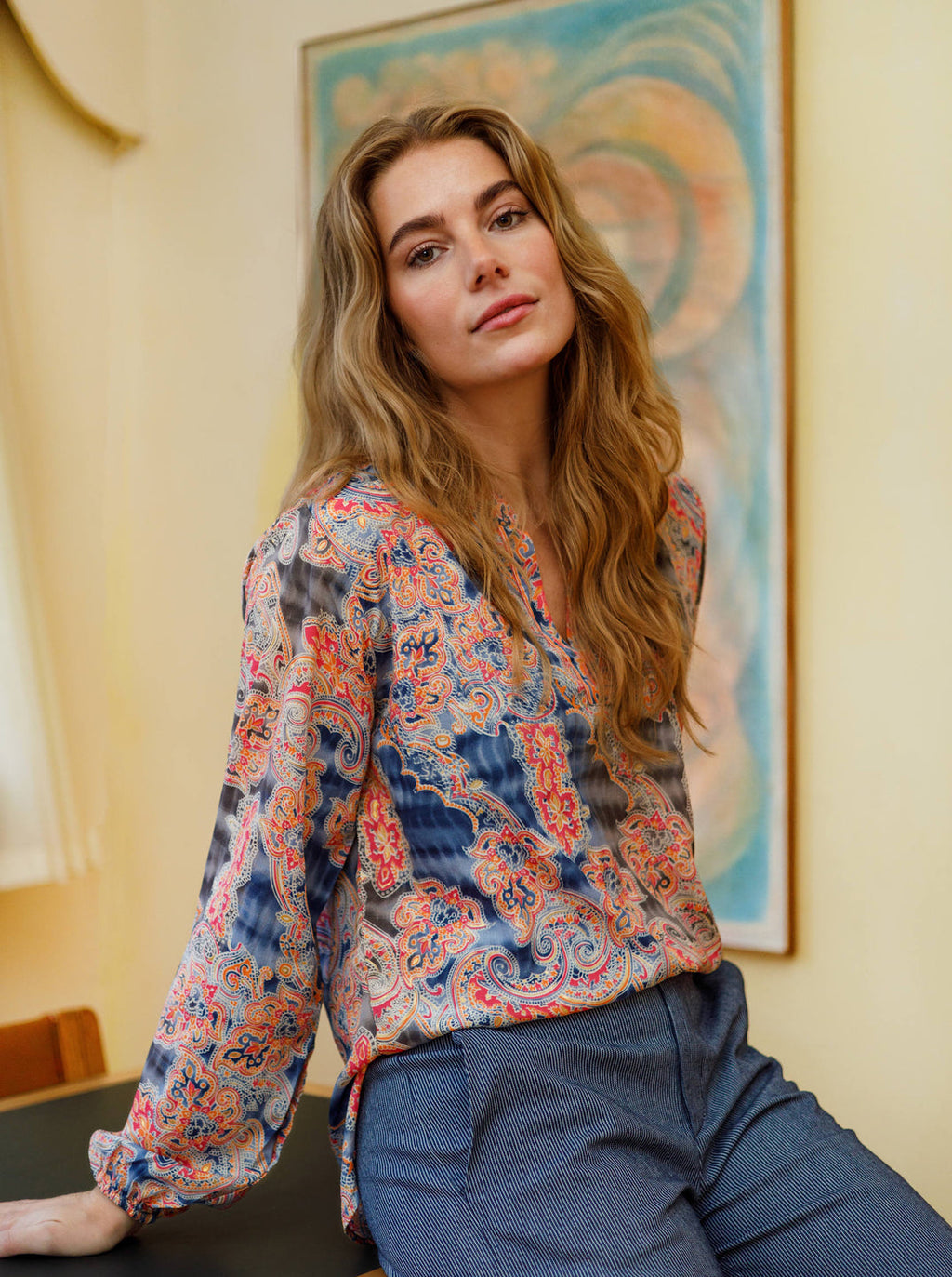 Vores Luna bluse er en af vores absolut bedst sælgende styles, og det forstår vi godt. Luna blusen er lavet i det smukkeste livlige stof, der falder smukt på kroppen. Blusen har elastik ved ærmeåbningen og en feminin v-hals. Vores populære Luna bluse findes i de smukkeste print, som er helt unikke.