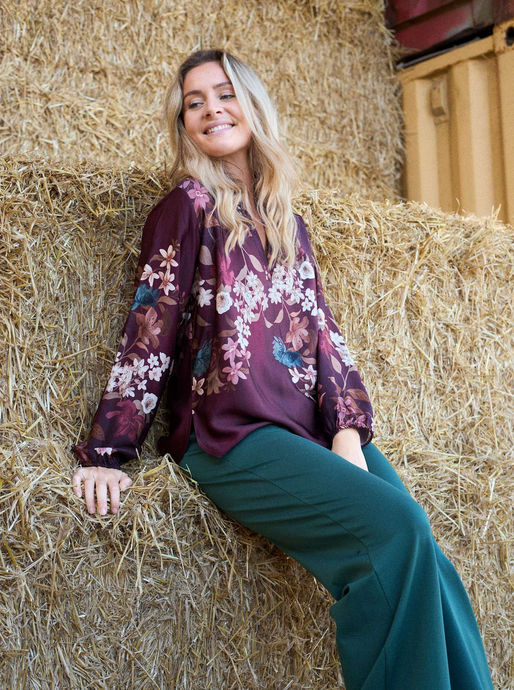 Bluse i let og blød viskosekvalitet med V-udskæring og lange ærmer. Modellen har en løs pasform, der giver et afslappet og behageligt fald. Nem at style både til bukser og nederdele for et feminint hverdags- eller festlook.