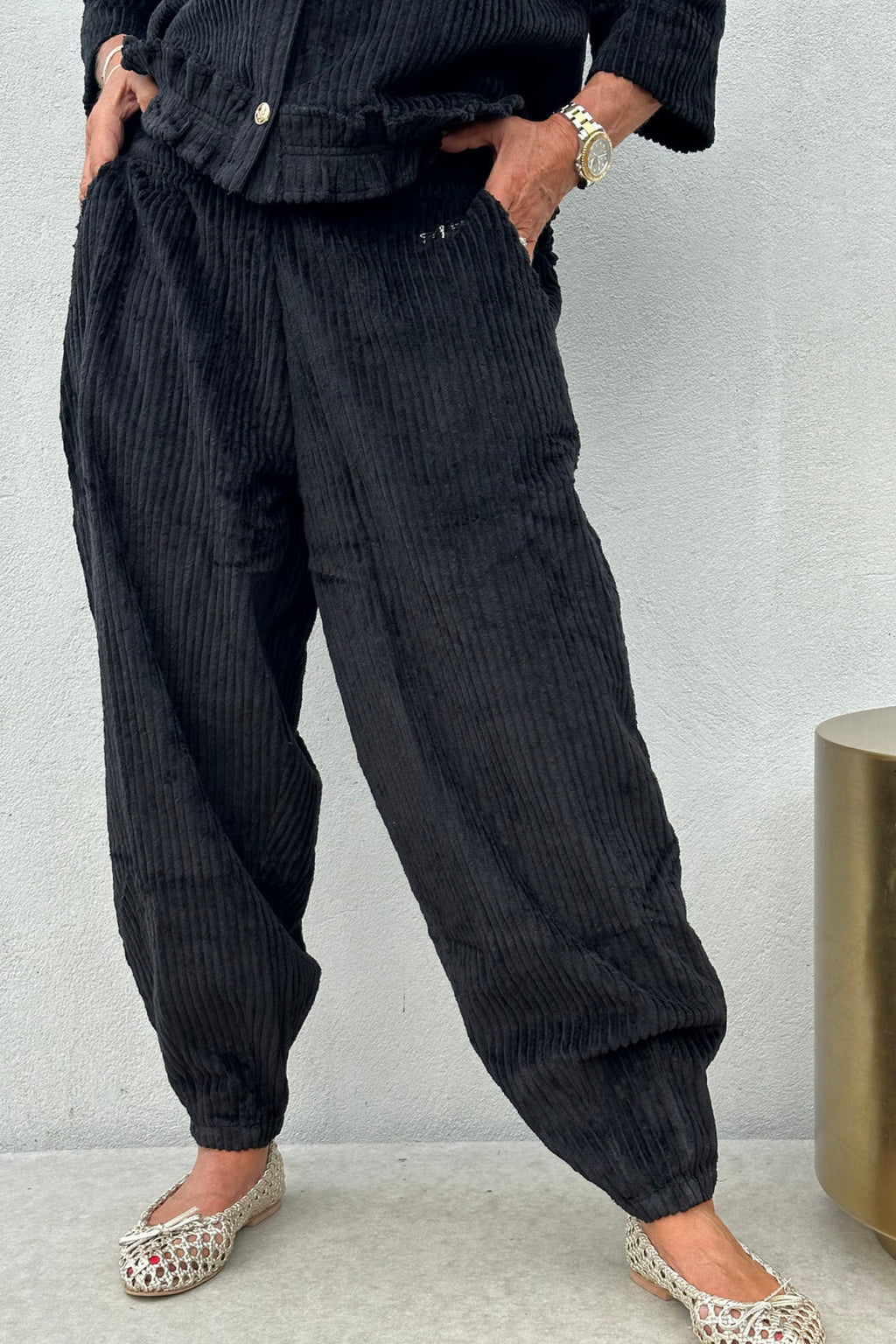 Den populære barrel-buks er nu lanceret i en ny, lækker version i blød jernbanefløjl – et cool og moderne valg til både hverdag og afslappede outfits. Buksen har masser af vidde i lårene og går smalt ind forneden, hvilket giver den karakteristiske, afslappede silhuet. Modellen stumper let og skaber et casual, men stilfuldt udtryk.