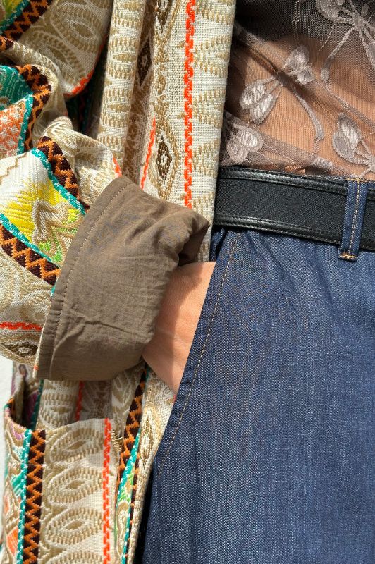 Giv din garderobe et kunstnerisk og farverigt løft med denne unikke frakke, der kombinerer klassisk pasform med moderne boheme-vibes. Frakken er fremstillet i et struktureret vævet tekstil med et levende og detaljerigt etnisk-inspireret mønster i jordnære toner med indslag af rød, grøn, lilla og turkis.