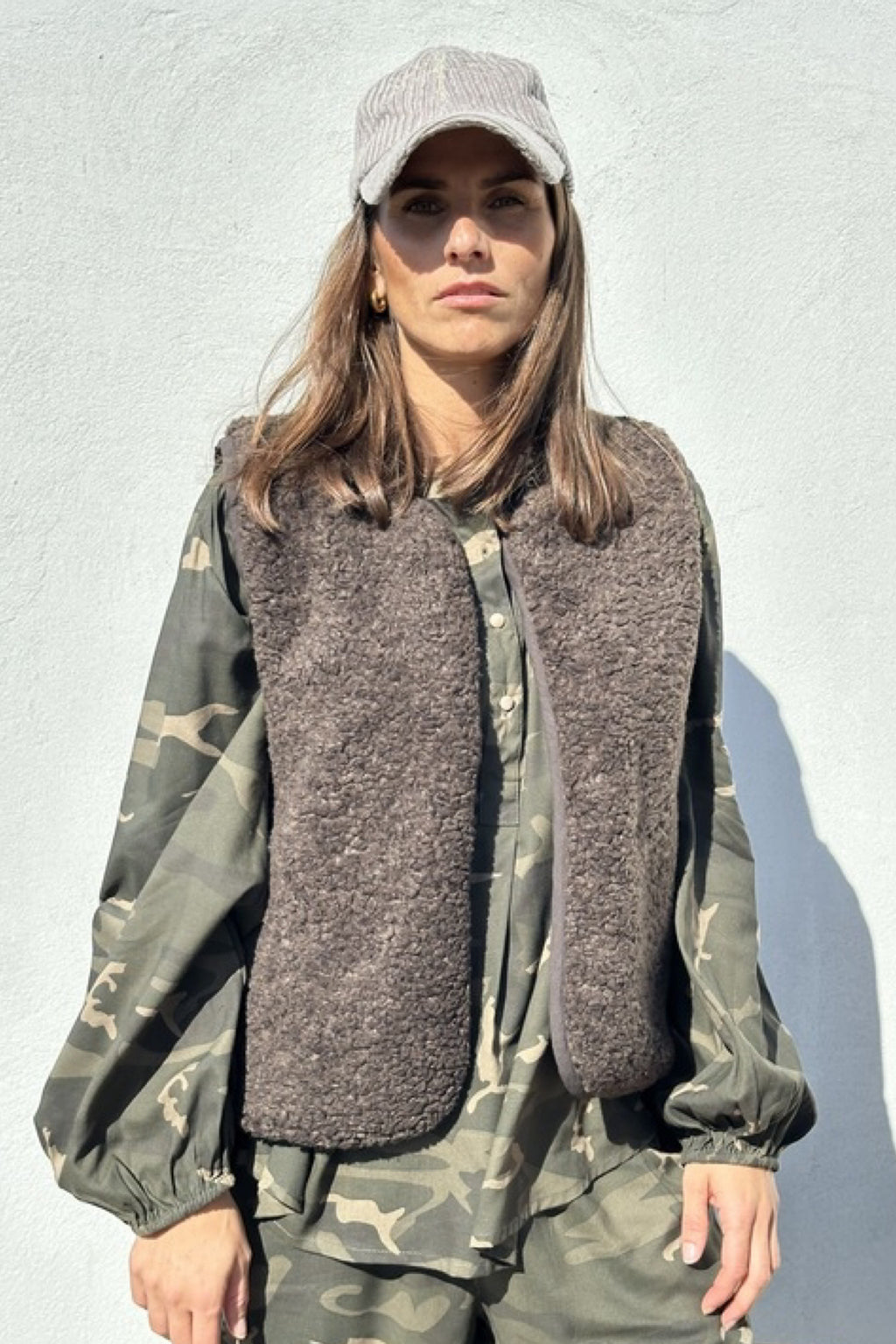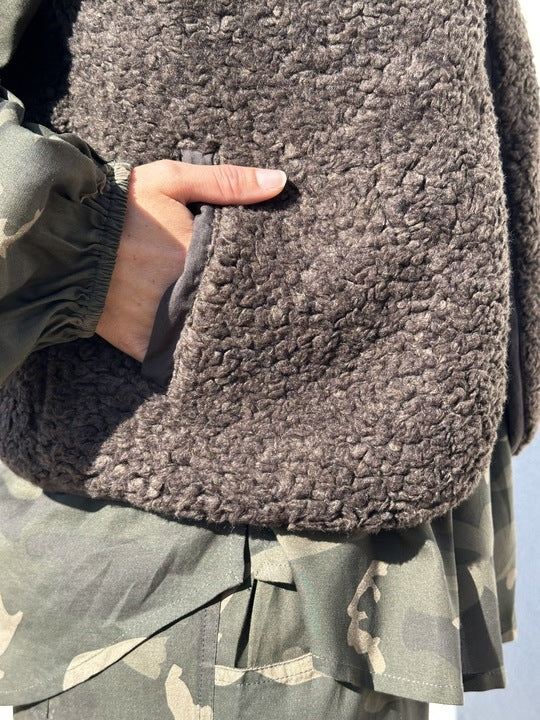 Kort teddyvest med stort guld logo broderi på ryg.
