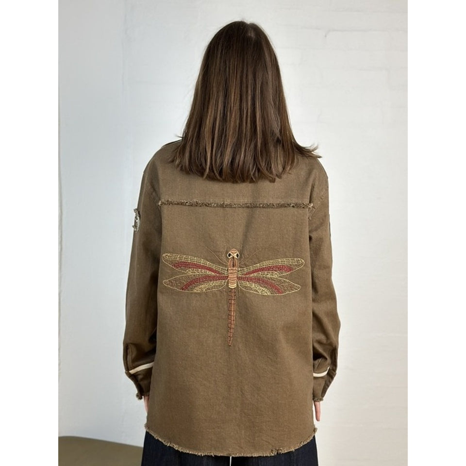 Cool cowboy jakke i fed cargo snit. Jakken har trykknapper og masser af appplikationer. Her kan nævnes stor guldsmed på ryggen i lys denim.