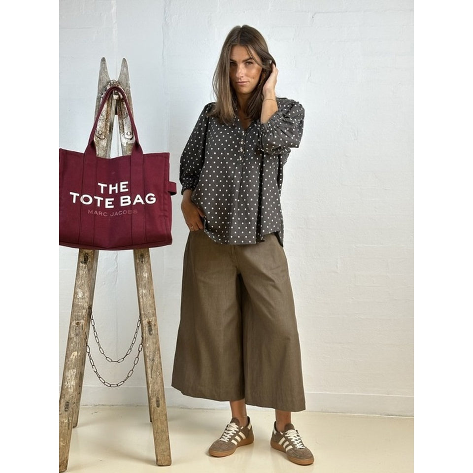Blusen har v-udskæring med matte guldknapper.