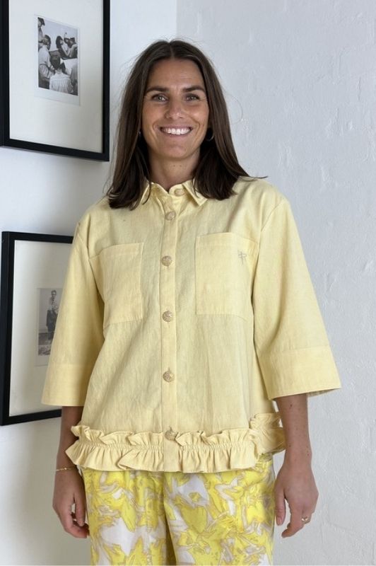 Blusen er designet med to rummelige frontlommer – den ene prydet med vores karakteristiske guldlogobroderi for en diskret, men eksklusiv detalje. Nederst afsluttes modellen med en smuk flæsekant, der skaber en let og flatterende silhuet.