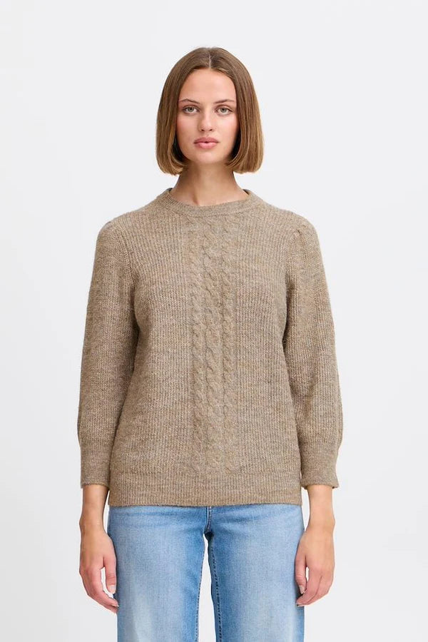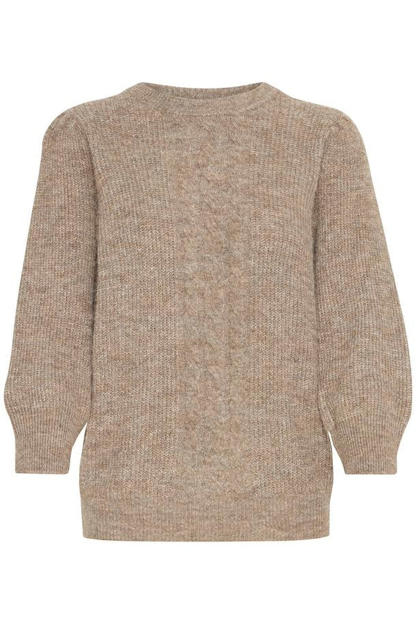 Klassisk langærmet rundhalset strik med snoninger ned foran.