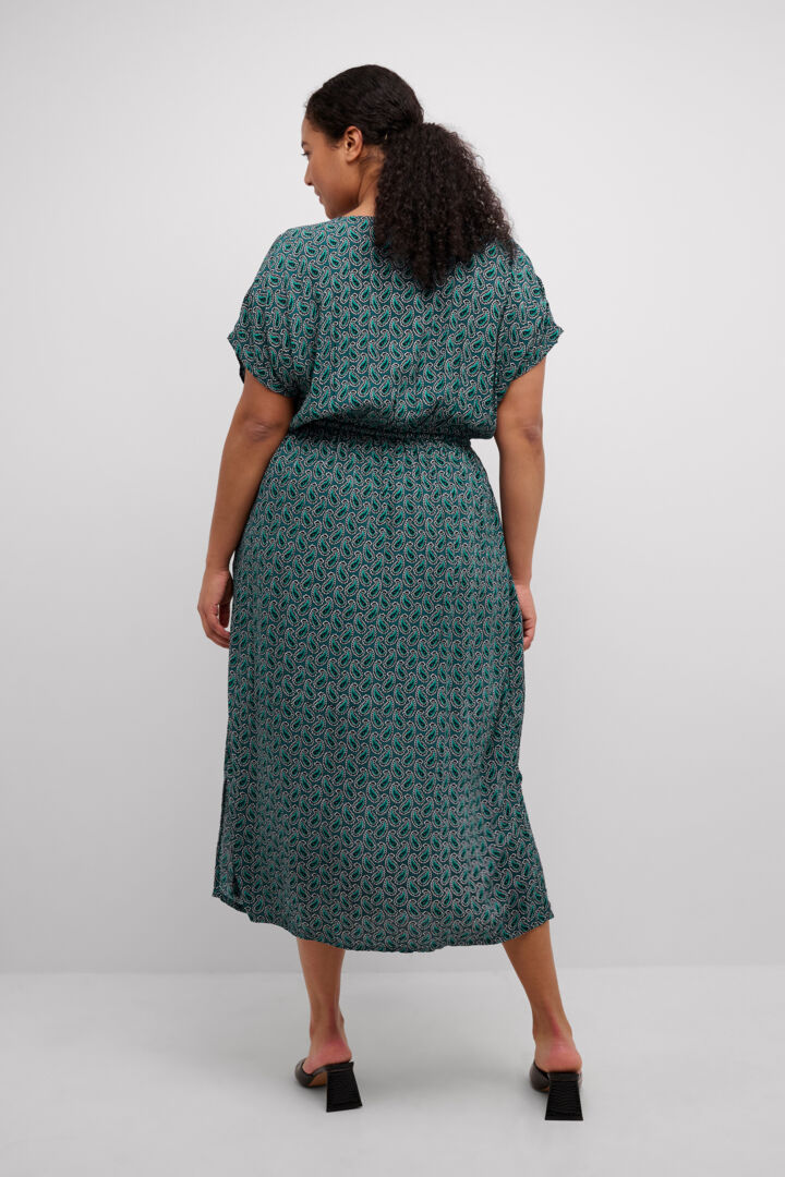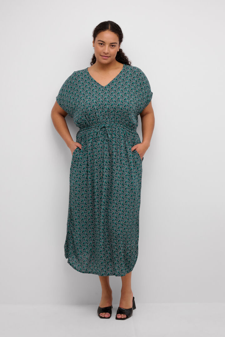 Super sød kjole fra Kaffe curve med let elastik i taljen og kan snørers ind. Den har korte ærmer og en fint print.