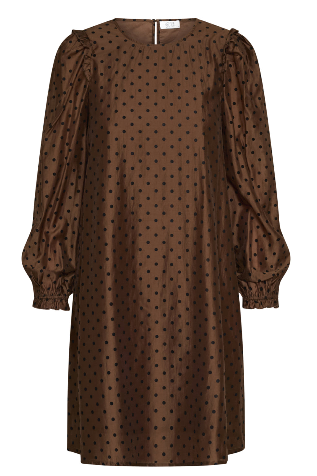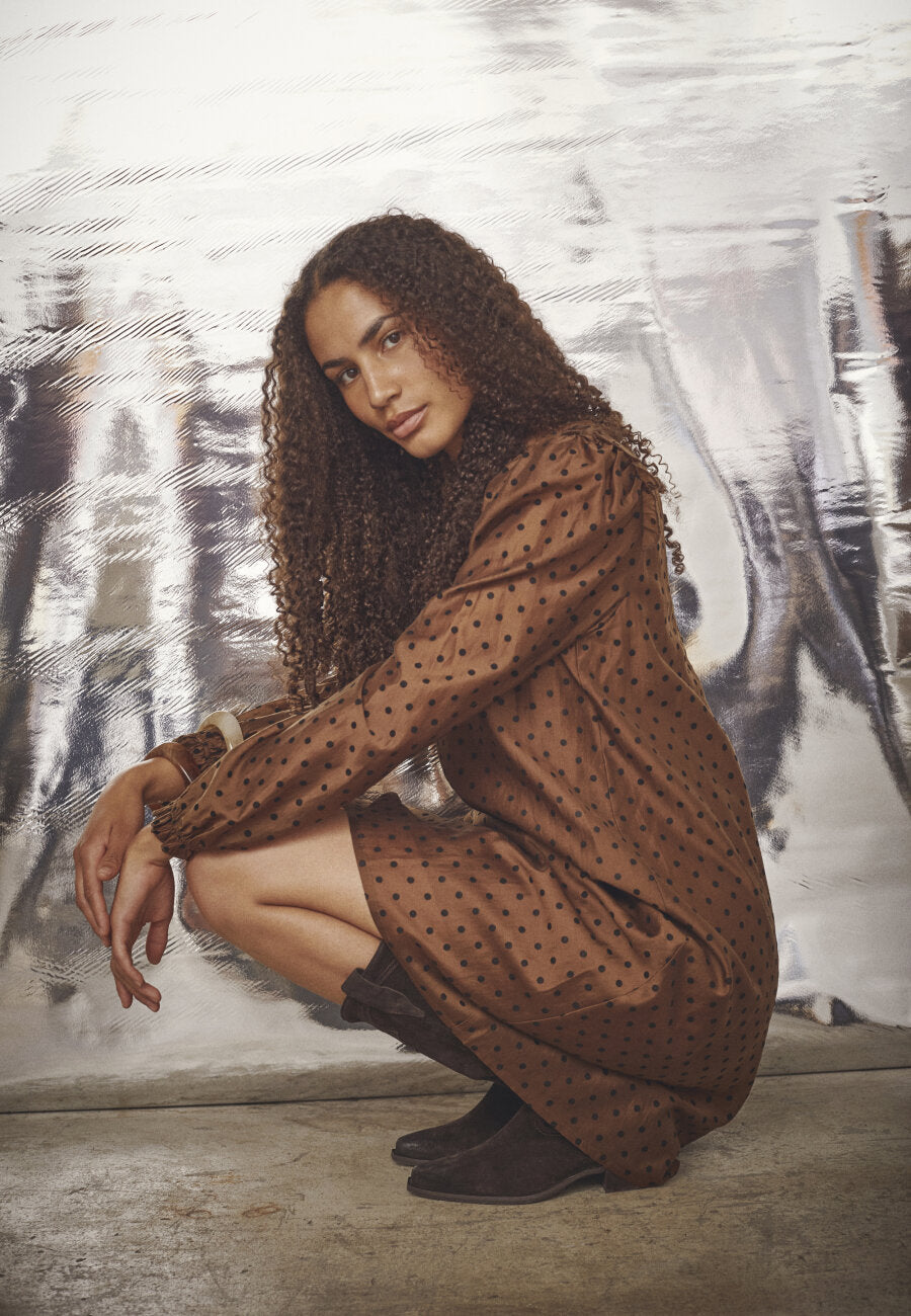 love870-3 er en kort kjole med et prikket mønster. Kjolen har en rund halsudskæring, lange ærmer med let puf ved skuldrene og en løs pasform. Modellen har en str. S på.