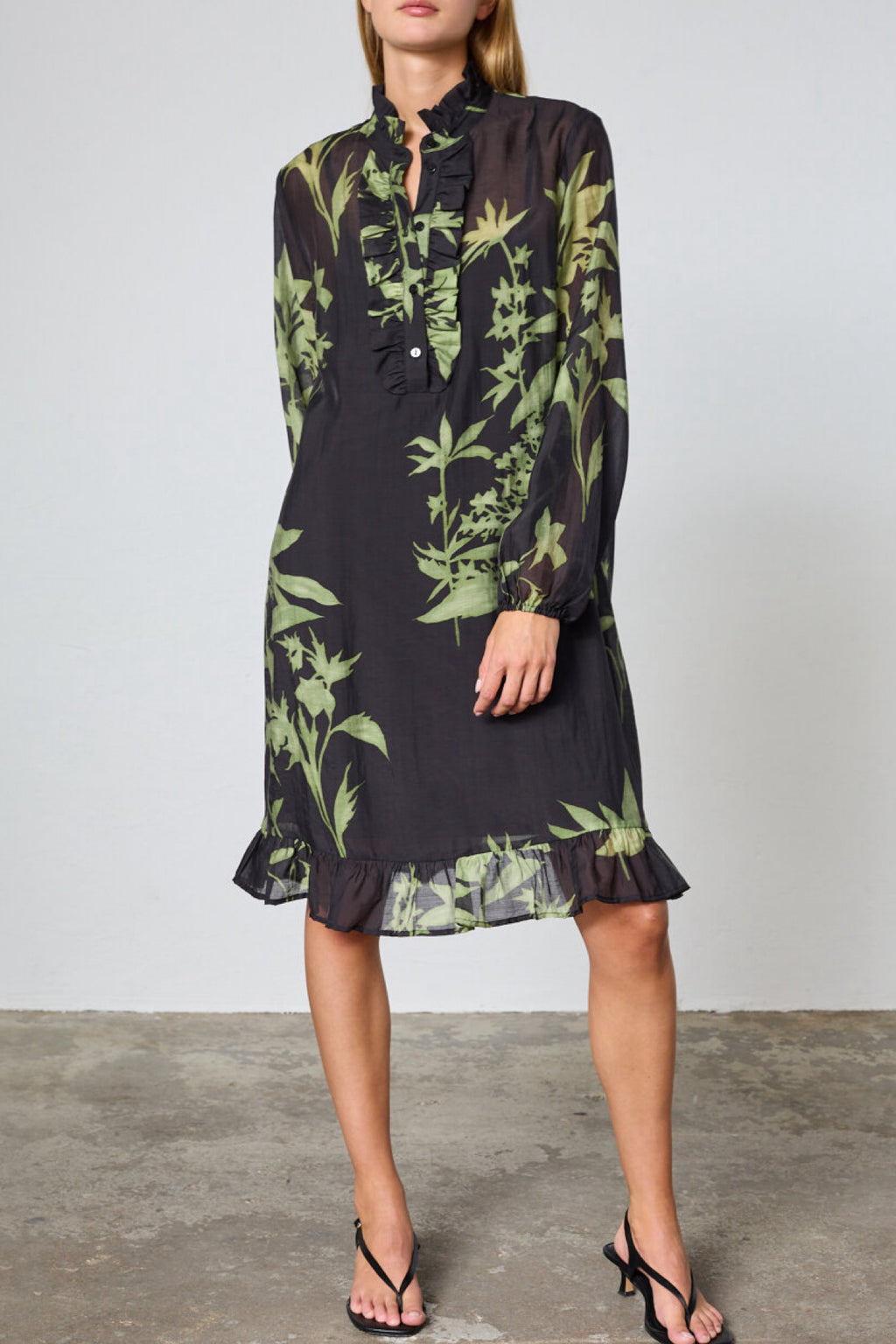 love1449 er en kjole med lange ærmer med rynker og et abstrakt print. Den har en lille stående krave med flæser, rynkede manchetter og en knaplukning. Modellen har en str. S på