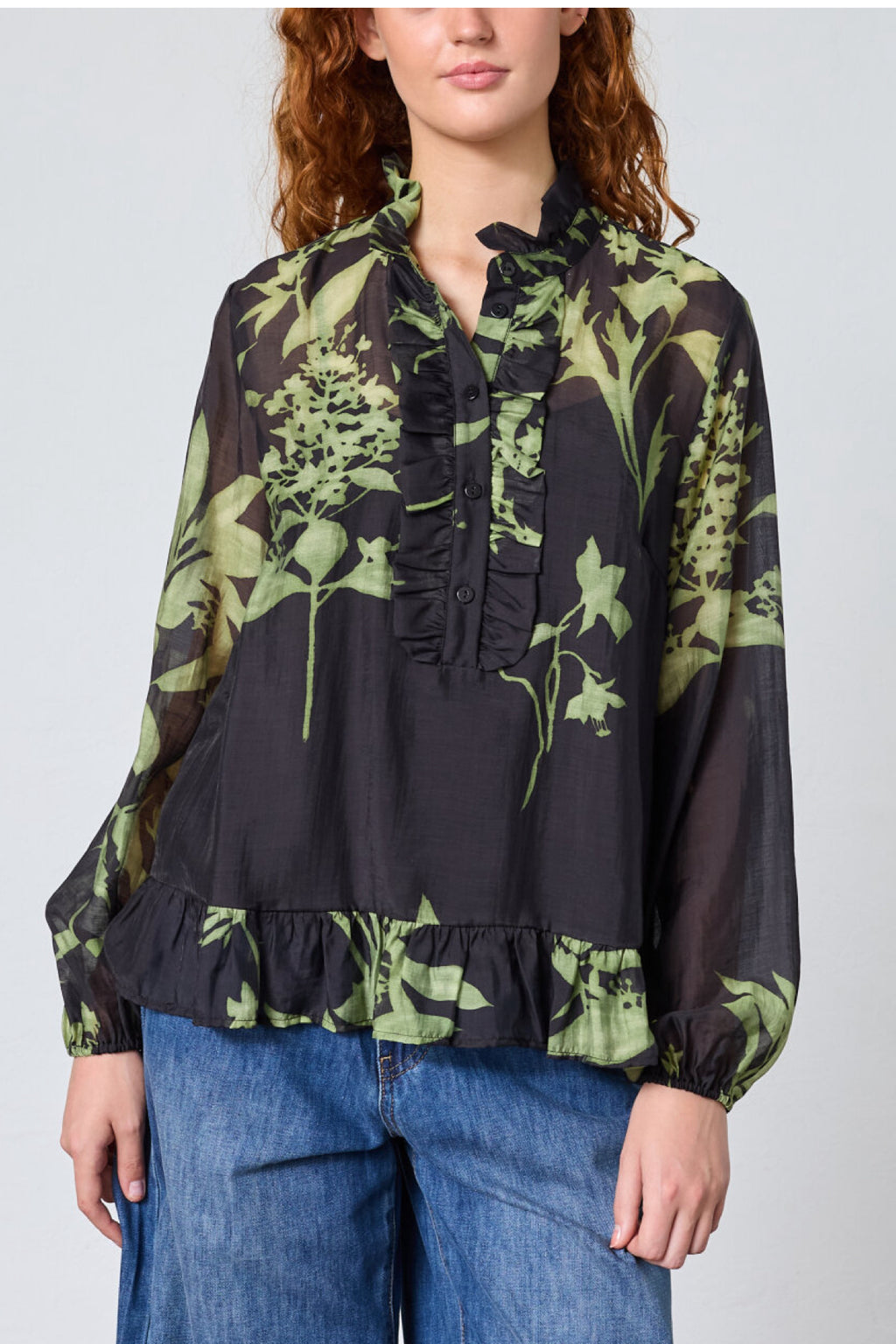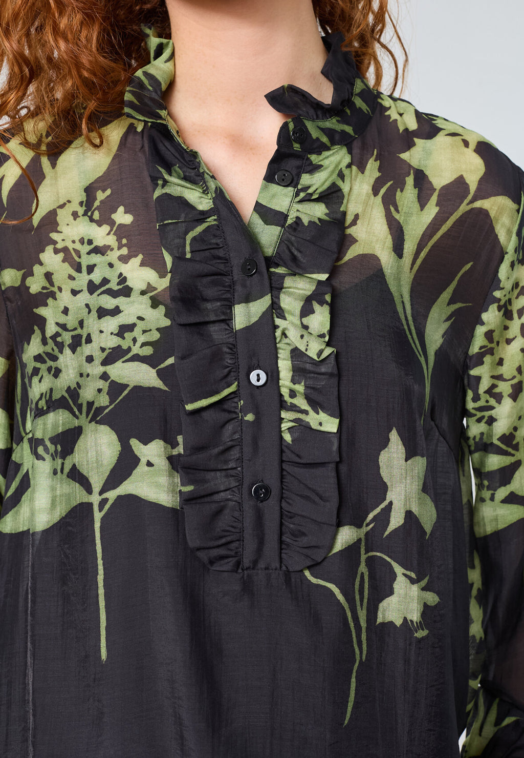 love1457 er en overdel med lange ærmer med rynker og et abstrakt print. Den har en lille stående krave med flæser, rynkede manchetter og en knaplukning. Modellen har en str. S på