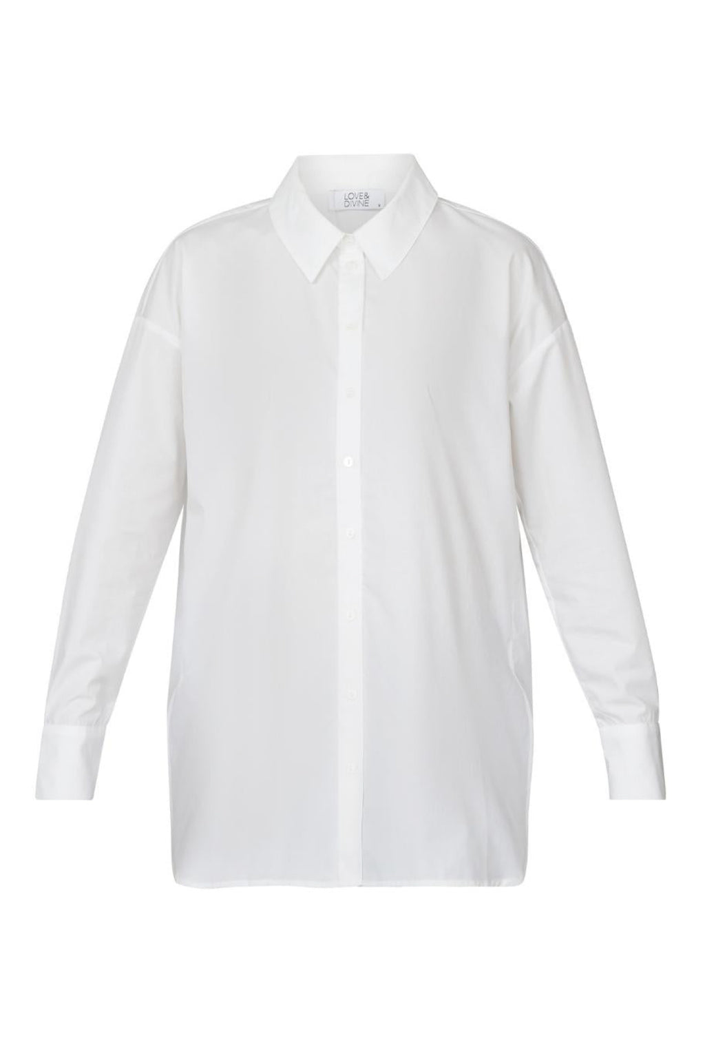 love765-11 er en oversized hvid skjorte med klassisk knaplukning og krave. Skjorten er stilren og enkel. Modellen har en str. S på. Skjorten er strygefri.