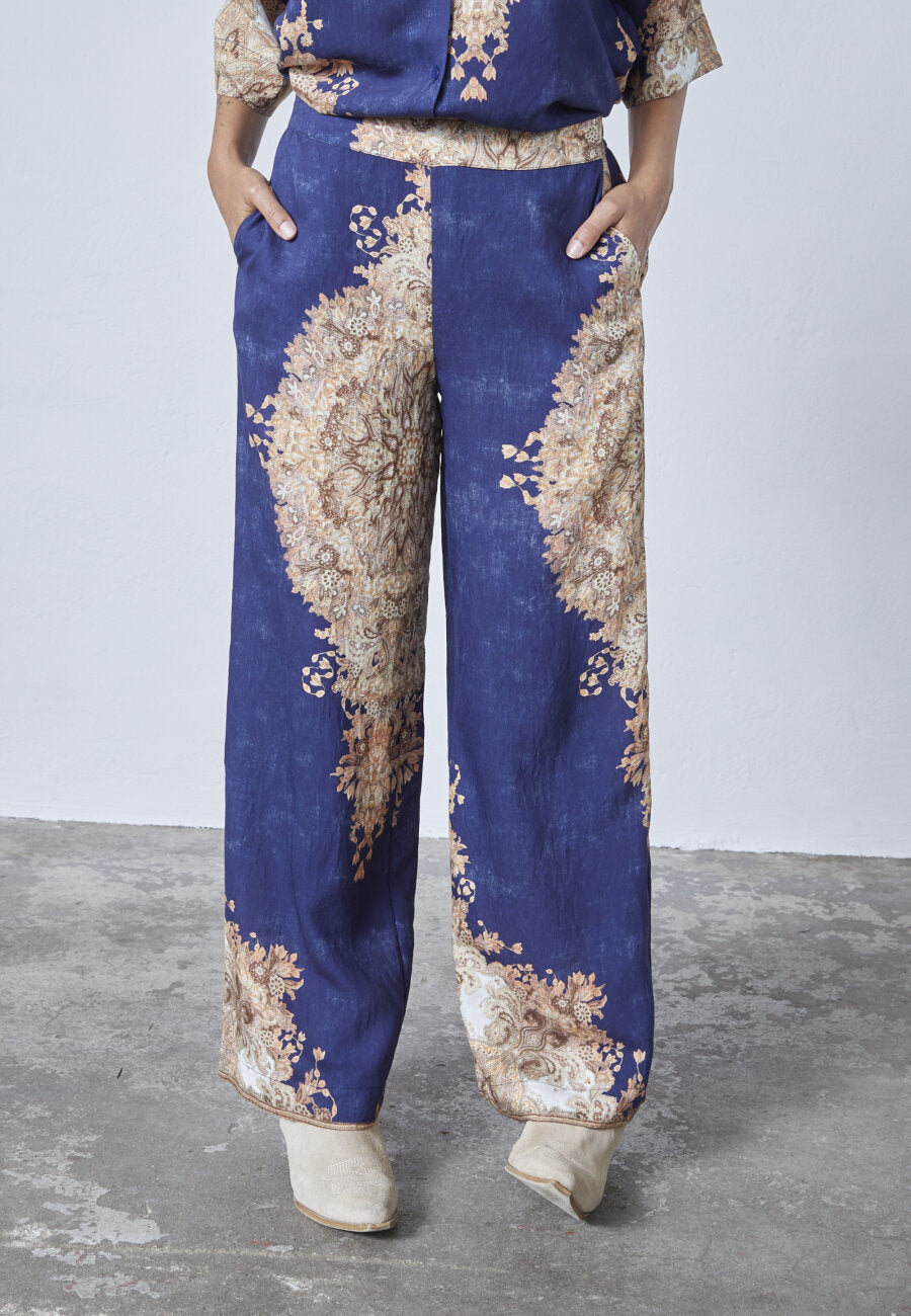 love1176-5 er et par bukser med et løstsiddende og behageligt fit. De har en elastisk talje, der sikrer en god pasform. Bukserne er prydet med et unikt paisleymønster. Modellen har en str. S på.