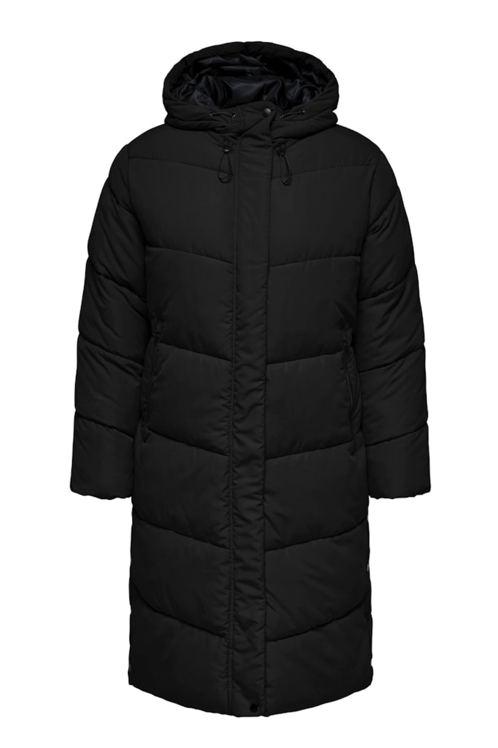 Klassisk lækker lang puffer coat i sort med hætte og lynlås.
