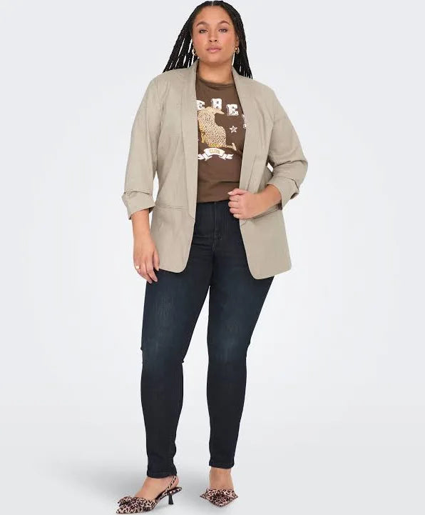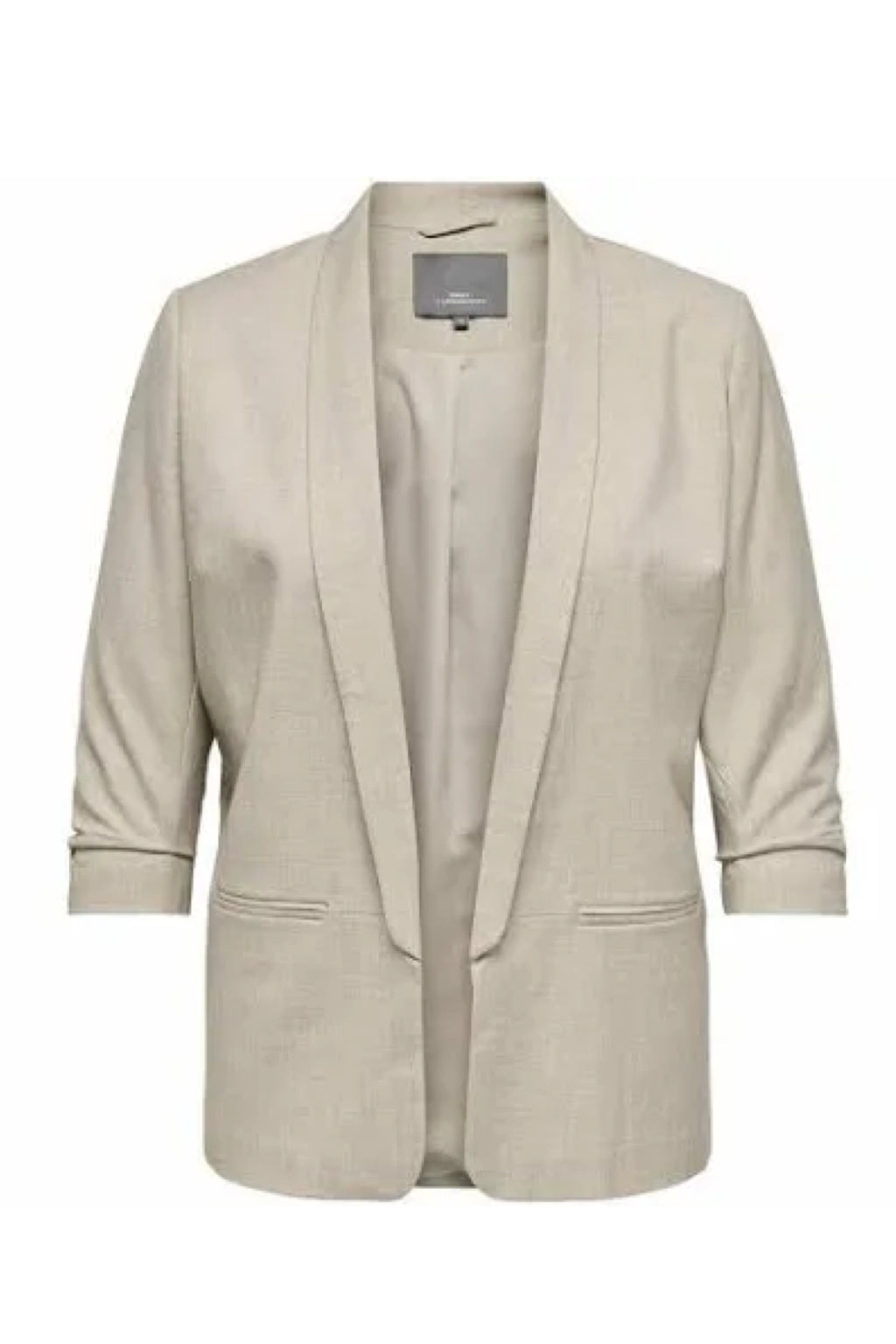 Fin sandfarvet blazer med 1/3 ærme som har rynke effekt. Blazeren er løsthængende uden lukning.