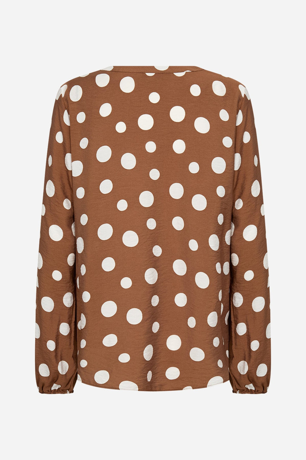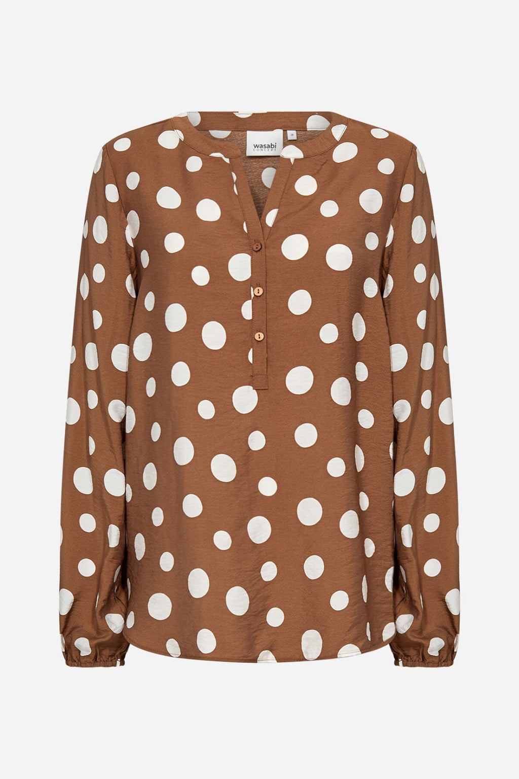 WA-CELIA 1 er en feminin bluse fremstillet af 82% LENZING™ ECOVERO™ viskose, 18% polyamid. Den har et elegant polkaprikket print, en delt halsudskæring og en knaplukning. Sæt den sammen med skræddersyede bukser eller en afslappet denimnederdel for et unikt look.