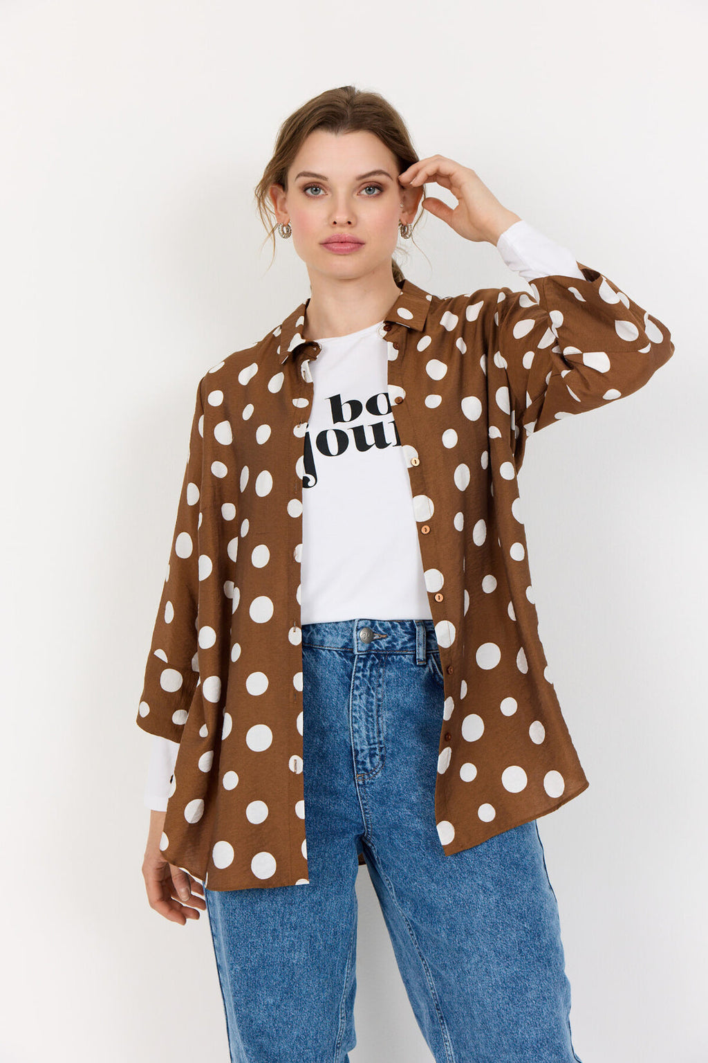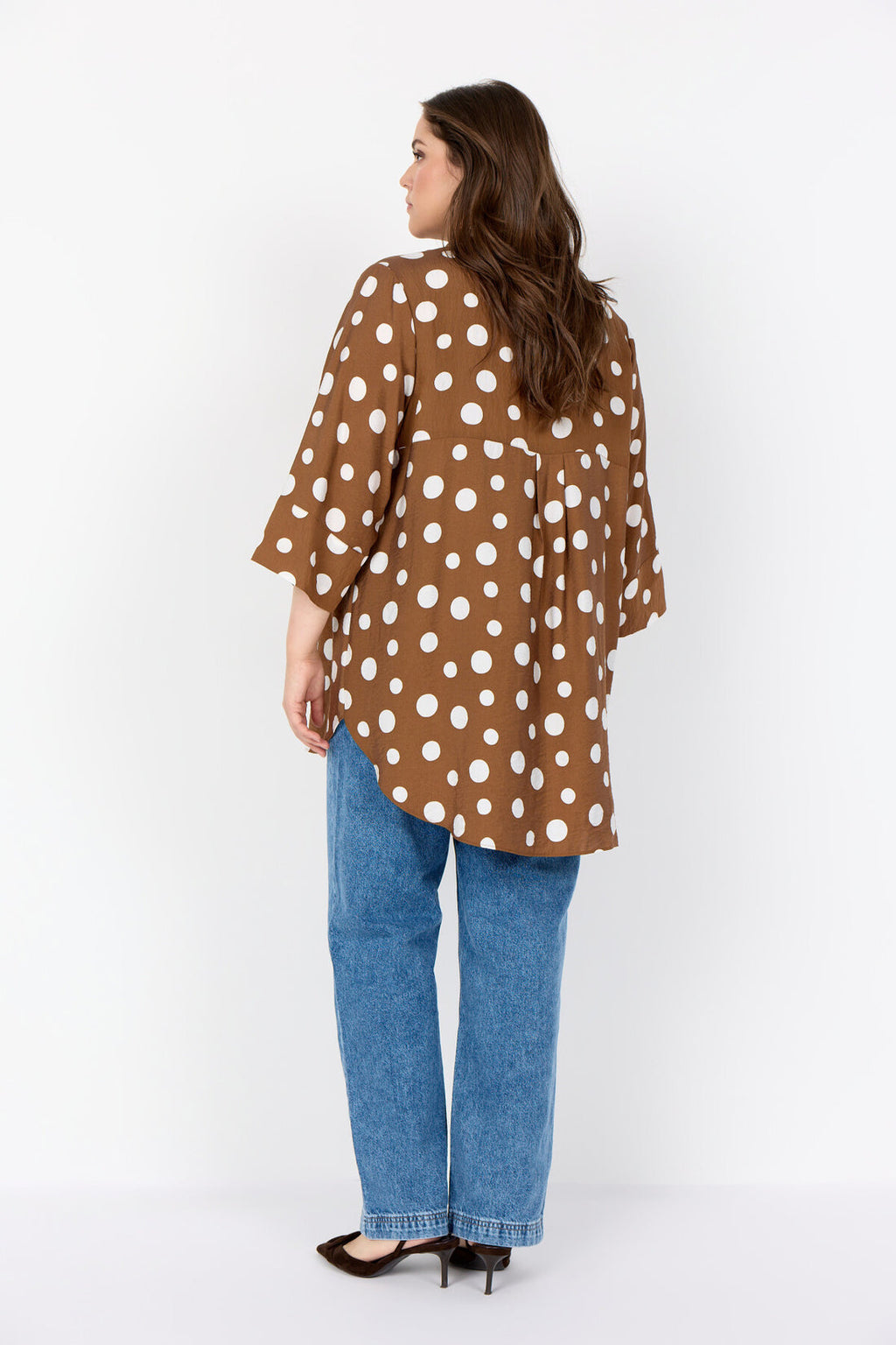 WA-CELIA 2 er en unik skjorte fremstillet af 82 % LENZING™ ECOVERO™-viskose og 18 % polyamid. Denne unikke skjorte har en klassisk krave, knaplukning foran, et dristigt prikprint og 3/4-ærmer. Sæt den sammen med skræddersyede bukser eller denim for et elegant look.