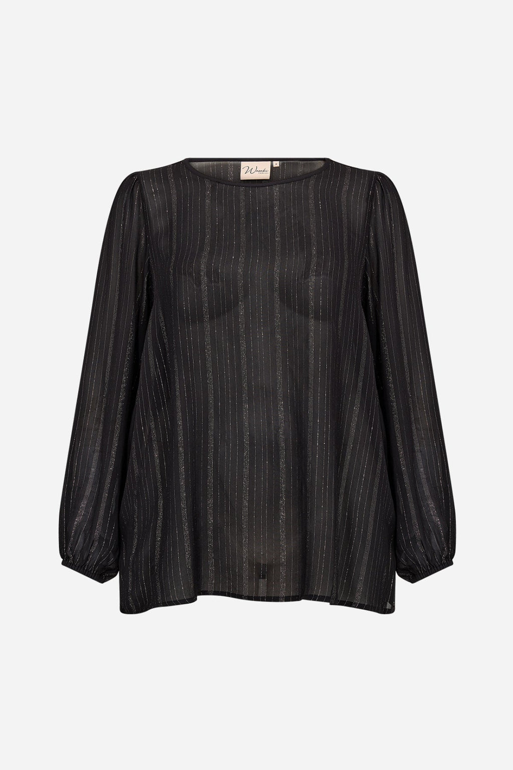 WA-SELA 1, blusen er fremstillet af 99% viskose og 1% lurex. Denne elegante bluse har lange ærmer, en rund halsudskæring og et diskret metallisk stribeprint med en smuk tekstur, der giver et unikt præg. Sæt den sammen med skræddersyede bukser eller jeans for et sofistikeret look.