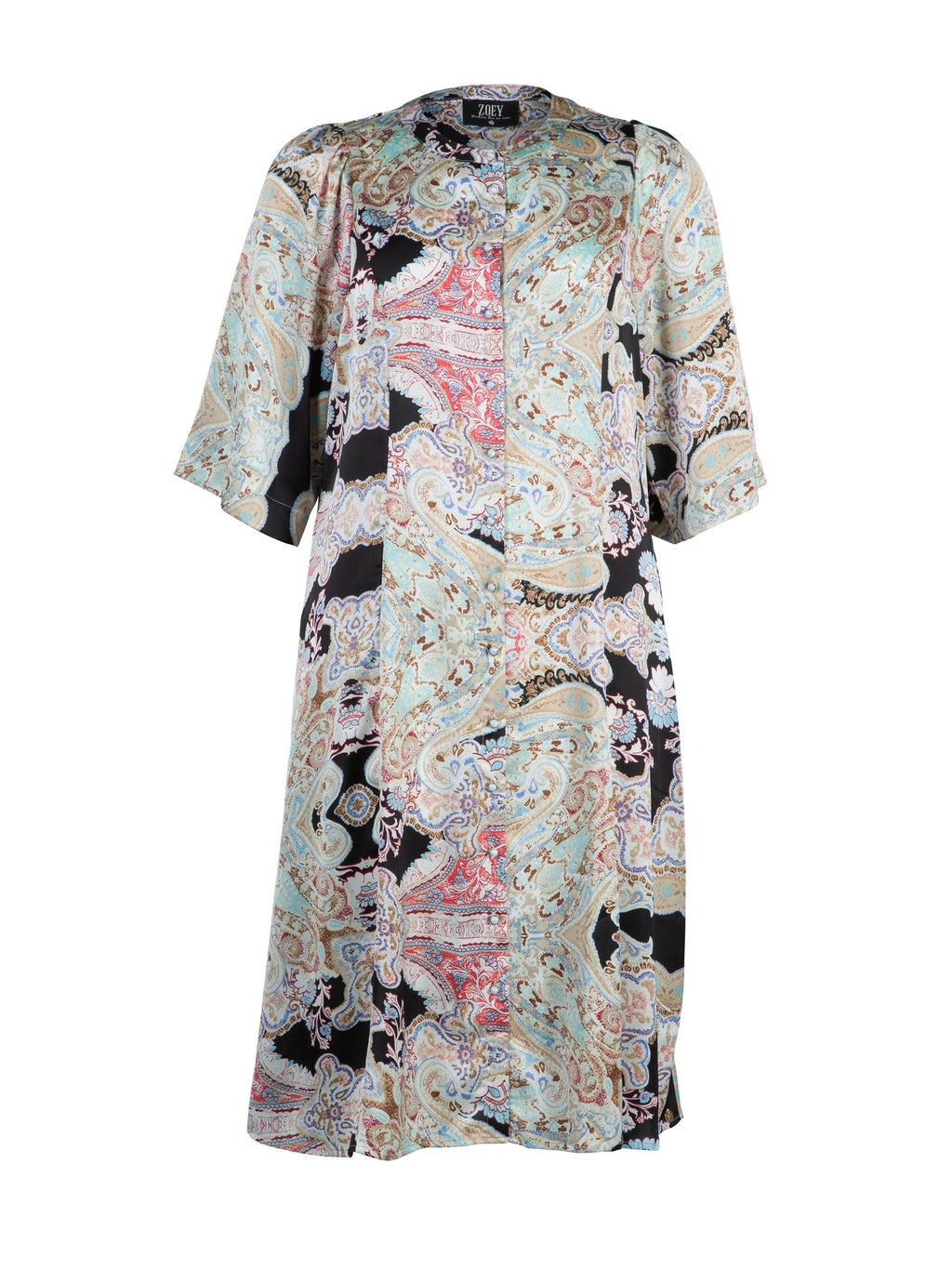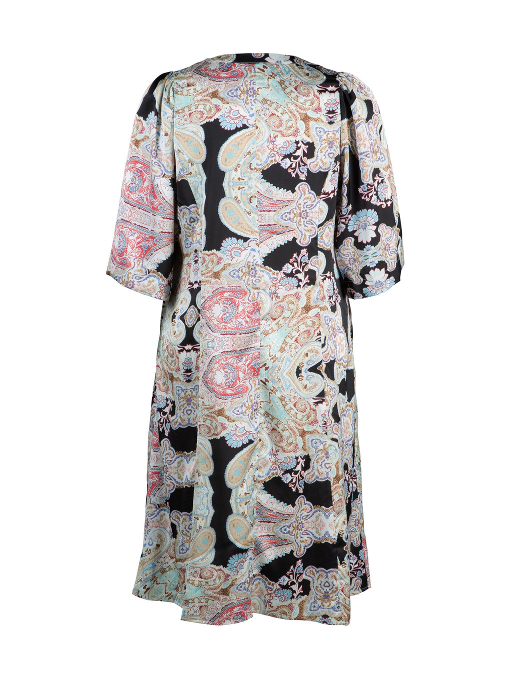 Smuk lang kjole med rund hals og knapper hele vejen ned foran. Kjolen har albuelange ærmer med vidde og puf ved skulderen. Kjolen er skåret i prinsessesnit, hvilket giver den talje uden at den sidder helt til og kommer i et farverigt paisleymønster på en sort bund • Kjole til under knæet • Smukke matchende knapper • Viskose kvalitet med paisleymønster