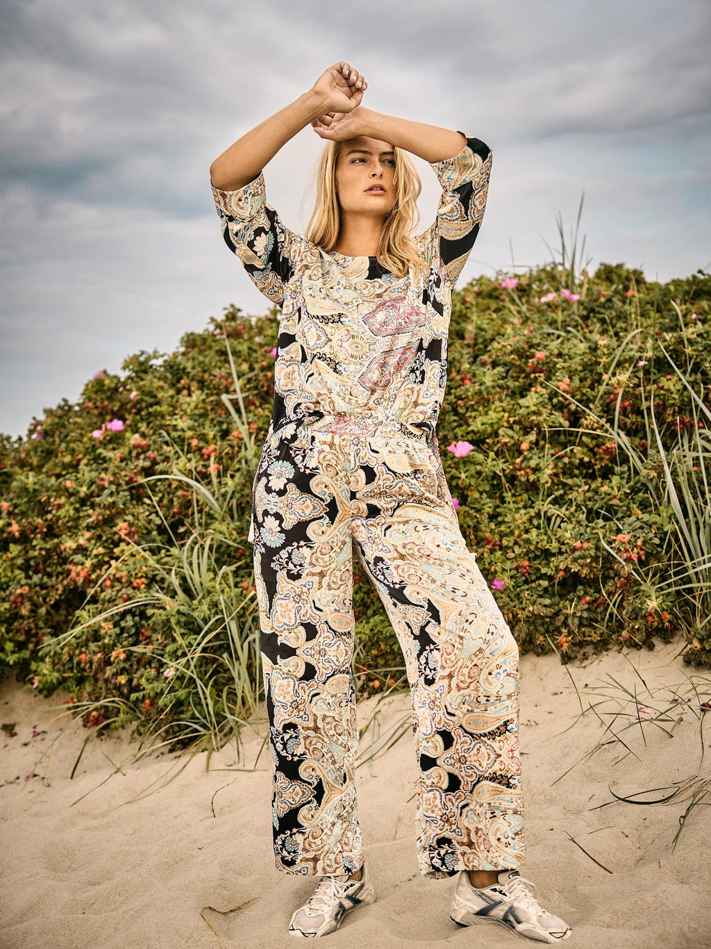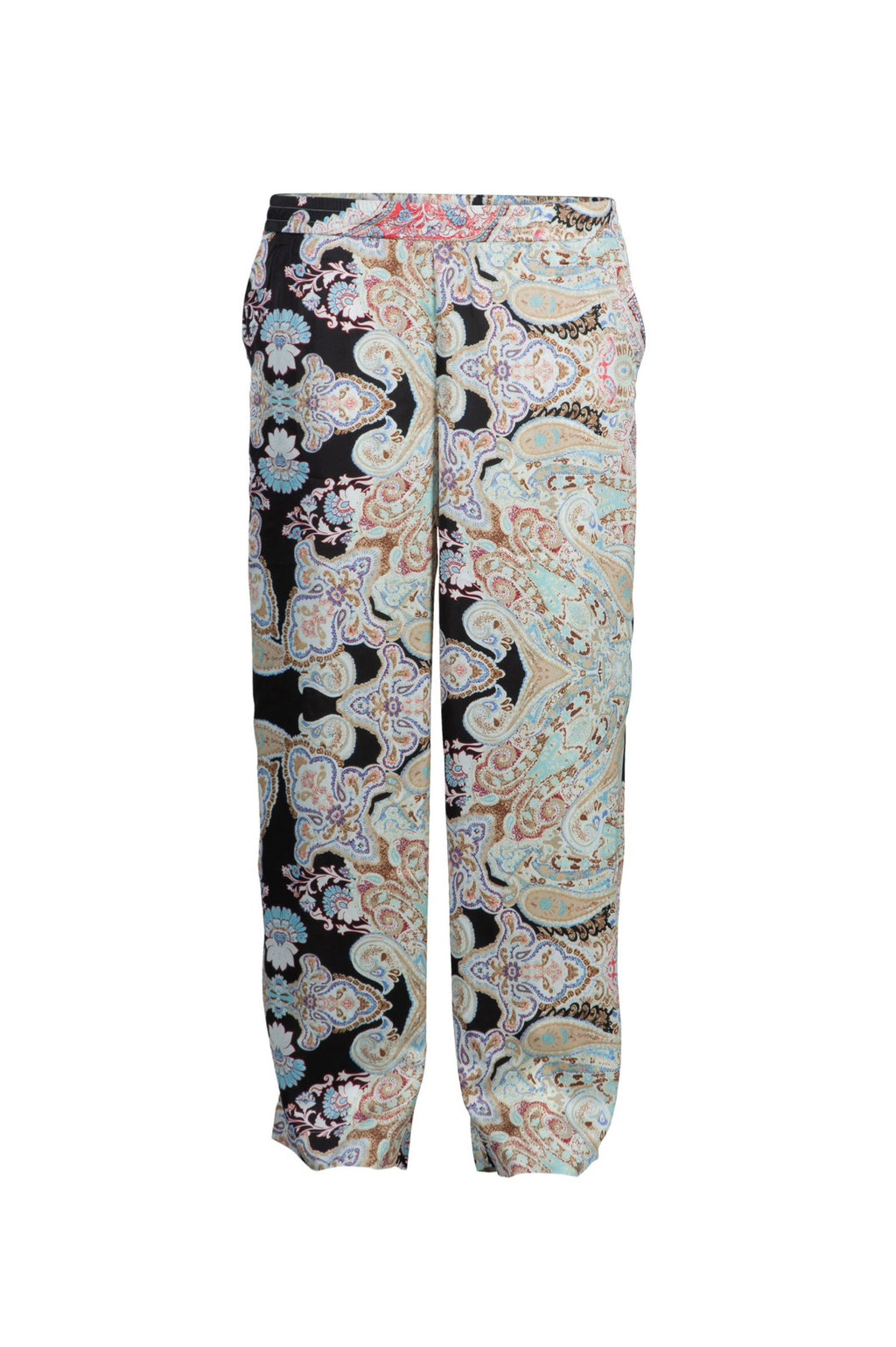 Skønne printede brede bukser med elastik i taljen. De lange bukser har skrålommer og et farverigt paisleymønster på en sort bund. Bukserne er lavet af viskose. • Brede, lange bukser • Viskose kvalitet • Paisley mønster i mange farver
